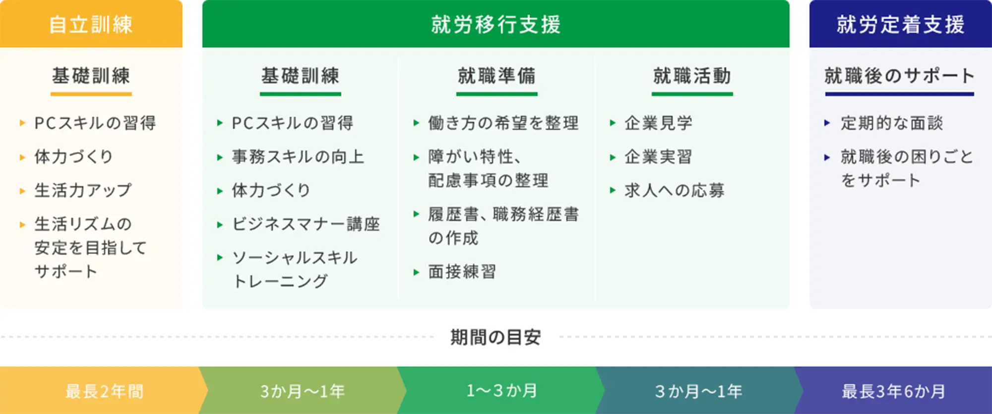 訓練期間は生活訓練と就労移行支援を合わせて2年半ほどで、就職後も就労継続支援でお世話になりました。